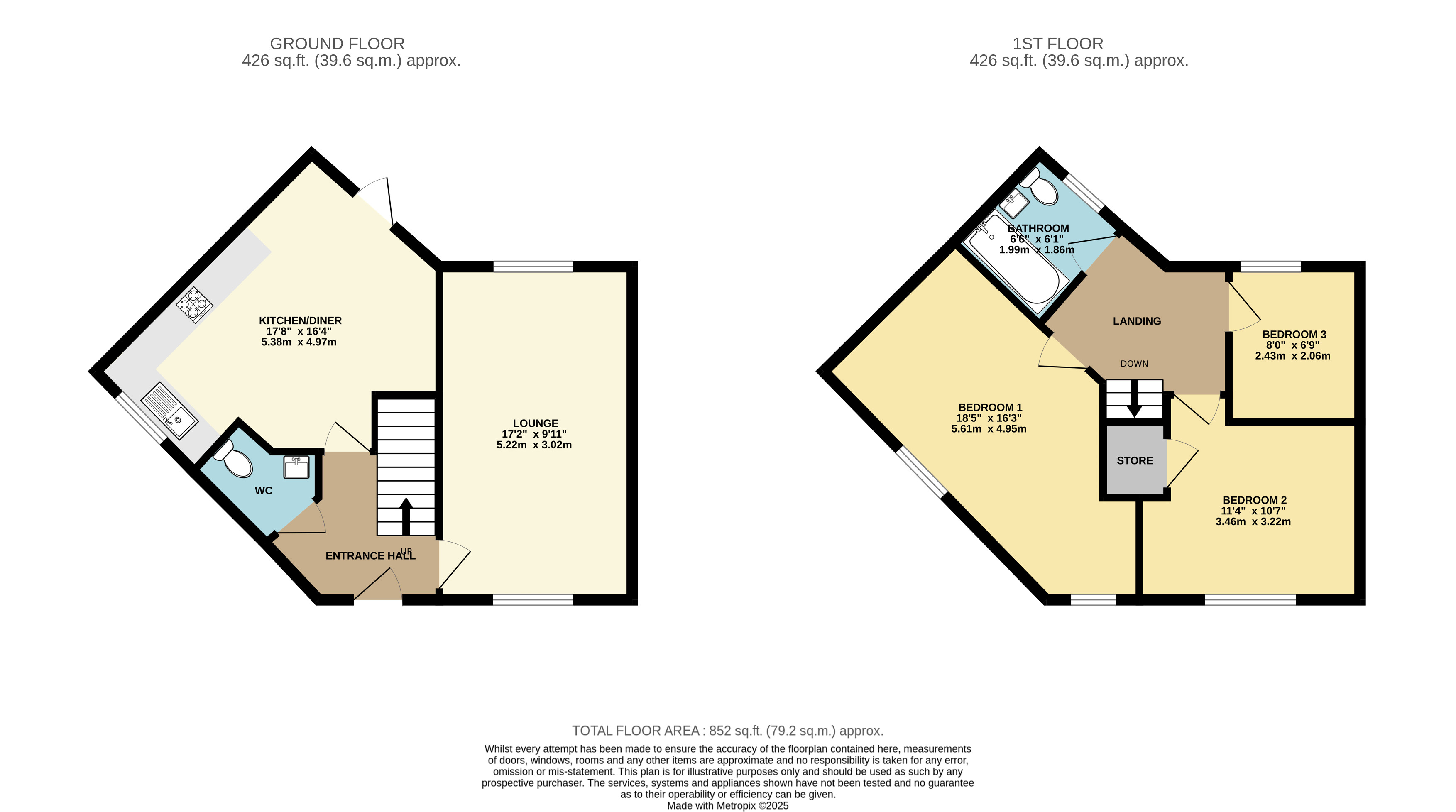 Upstairs, you’ll find three well-proportioned bedrooms. Two double bedrooms provide ample space, while the single bedroom is ideal as a child’s room, guest room, or home office. The master bedroom stands out with its quirky design, offering dedicated space for a dressing table and generous wardrobe storage. The family bathroom features a modern suite with shower over bath.